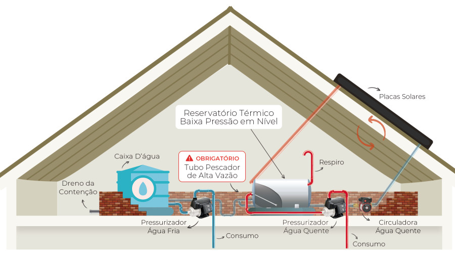 Pressurização de redes hidráulicas compostas por reservatório térmico (Boiler) de baixa pressão em nível com tubo pescador.